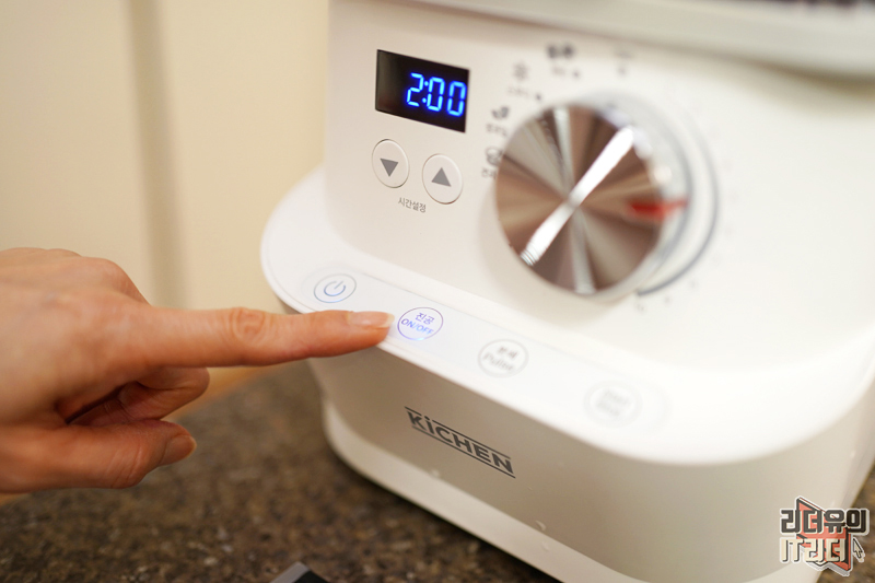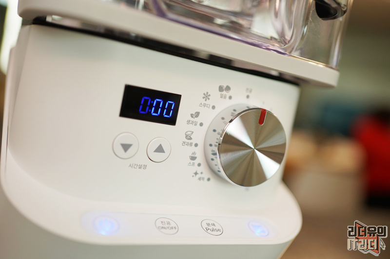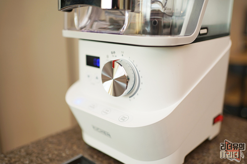 아래에는 화이트의 깨끗한 색상과 기능 컨트롤 다이얼과 직관적인 버튼, 그리고 타이머 디스플레이가 있습니다. 다이얼은 분쇄 강도를 조절하는 기능과 모드별 선택을 할 수 있습니다. 블렌더를 어떻게 사용해야 할 지 모르는 사람들도 쉽게 사용할 수 있게 했습니다.