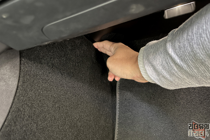 테슬라 모델Y 누수 확인 방법은 동승석 쪽으로 쉽게 확인이 가능합니다. 동승석 문을 열고 이 부분을 열어서 확인이 가능합니다.