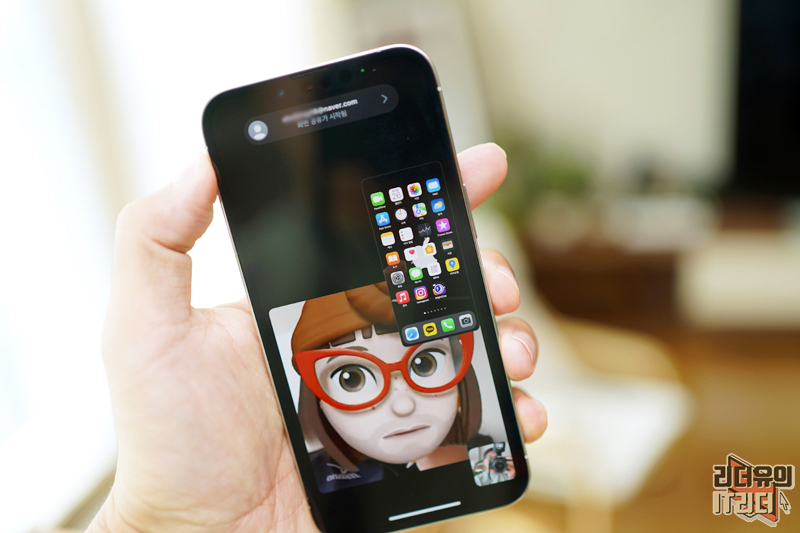 홈화면으로 나가면 상대의 모습이 이렇게 플로팅 상태로 보이고 화면을 컨트롤 할 수 있습니다. 컨트롤 하는 화면은 페이스타임을 보는 사람에게 그대로 전송되게 됩니다.