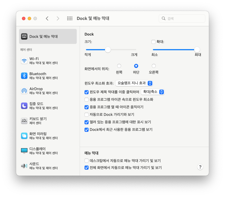 전체 화면시 메뉴 막대를 항상 보이게 하는 옵션이 생겼습니다. 메뉴의 접근성이 좋아졌습니다.