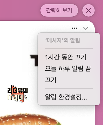 그리고 알림을 일정시간을 끌 수 있는 기능도 지원합니다. 메시지의 앱의 경우 메시지 자세히 보기를 보면 ...표시가 있습니다. 여기를 눌러 알림을 일정시간 끌 수 있습니다.