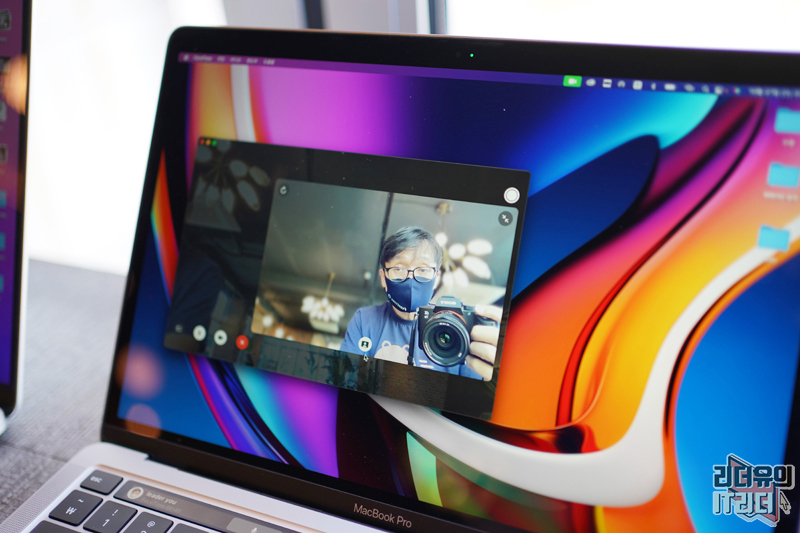 인물 사진 모드는 화면에서 선택이 가능한데요. 아래 인물 표시 아이콘이 있어 선택이 가능합니다. 인물 사진 모드가 실행되면 뒷배경을 아웃포커싱 효과로 날려줘 더욱 분위기있는 영상을 송출할 수 있습니다. 화상 대화 시대에 앞서나가는 애플의 기술력을 확인할 수 있는 기능입니다.
