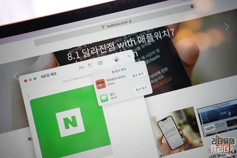 빠른 메모는 실행되는 앱에 따라 링크를 쉽게 넣을 수 있는 기능도 있습니다. 웹페이지를 보고 있을때 앱 링크 추가 메뉴를 선택하면 현재 보고 있는 페이지의 링크를 추가 할 수 있게 나옵니다.