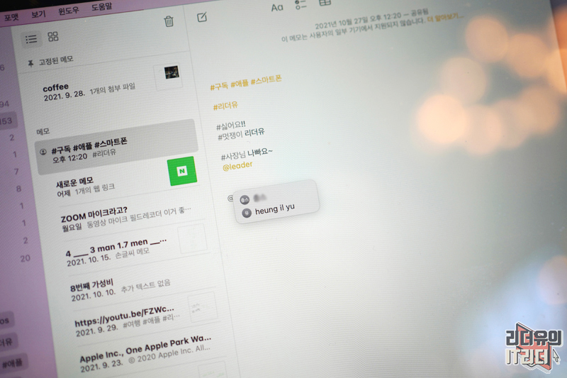그리고 공유된 메모에 참여한 사람에게 멘션을 보내는 기능도 있습니다. @를 넣으면 멘션을 보낼 대상을 지정해 메모를 남길 수 있습니다. 여러사람이 공동으로 메모를 작성할 때 유용한 기능으로 해당하는 사람에게 다이렉트로 알림을 보낼 수 있습니다.