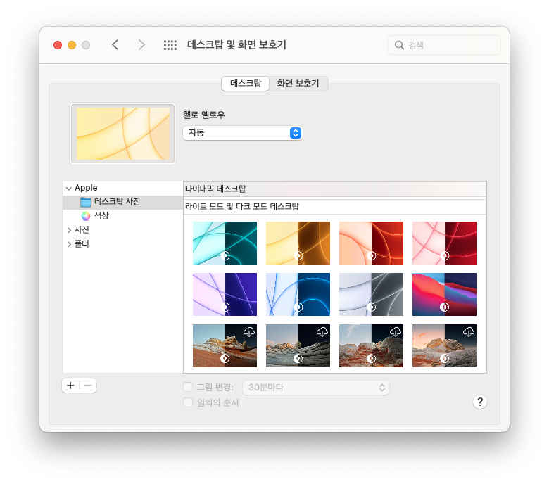 맥OS 몬터레이에서는 여러가지 데스크탑 배경화면이 추가되었습니다. 특히 주목해 볼 배경화면은 지난 M1 아이맥 24에 적용 되었던 7가지 색상의 배경화면이 생겼다는 것입니다. 라이트 버전, 다크 버전을 사용할 수 있고 산뜻한 컬러의 매력을 느낄 수 있으니 활용해 보시면 좋을 것 같습니다.