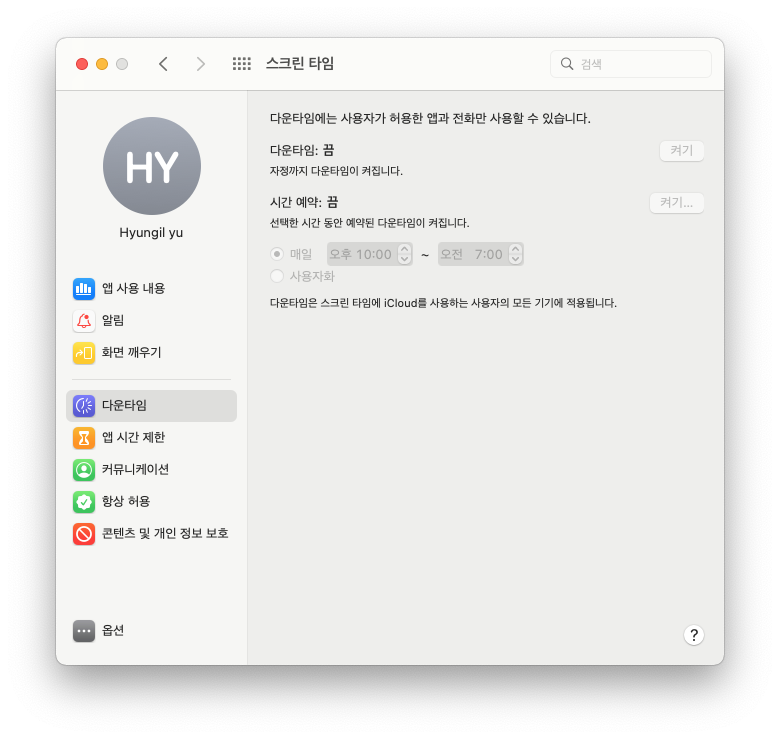 맥OS 몬터레이 스크린타임에서는 원하는 시간에 다운타임 활성화를 할 수 있습니다. 자동으로 시간에 맞게 켜지고 다운타임 중에는 전화 및 허용한 앱만 사용할 수 있습니다.