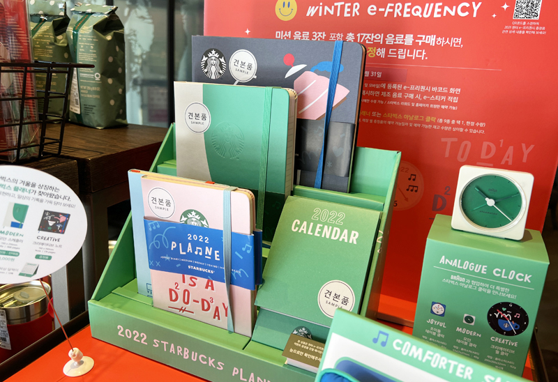 한해를 마무리 하는 스타벅스의 마지막 겨울 이벤트 2021 스타벅스 윈터 e-프리퀀시 이벤트가 진행되고 있습니다. 미션 음료 포함 총 17잔 음료를 구매하면 선물을 주는데요. 현재 스타벅스에는 상품으로 걸린 모던 테이블 클락, 스타벅스 플래너 3종이 전시되어 있습니다. 실물로 본 느낌 여러분은 어떻게 생각하시나요?