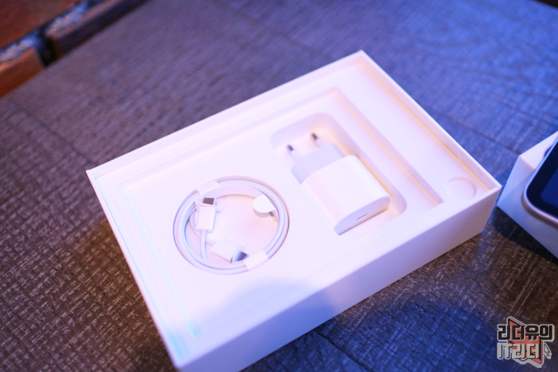 아이패드 미니 6세대 구성품이 들어 있는 모습입니다. 전원 어댑터와 USB-C to C 케이블이 제공됩니다.