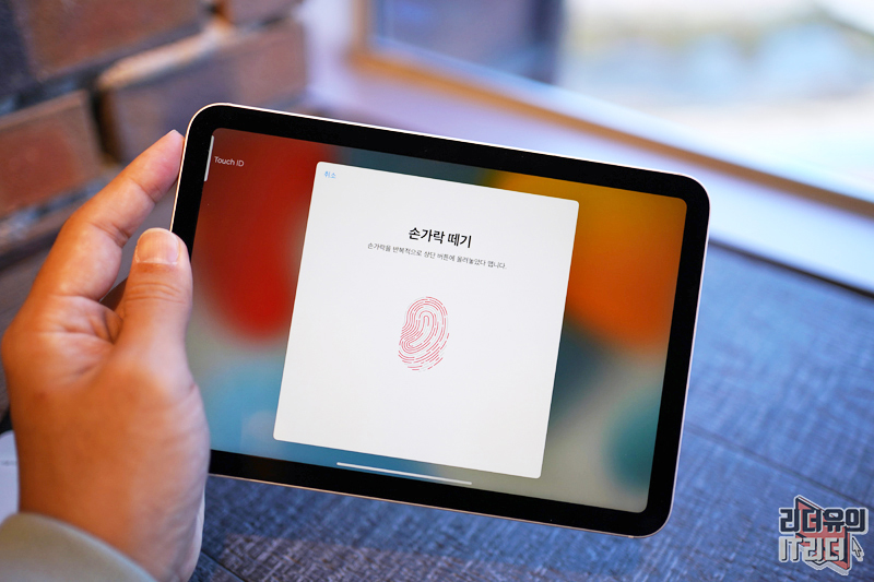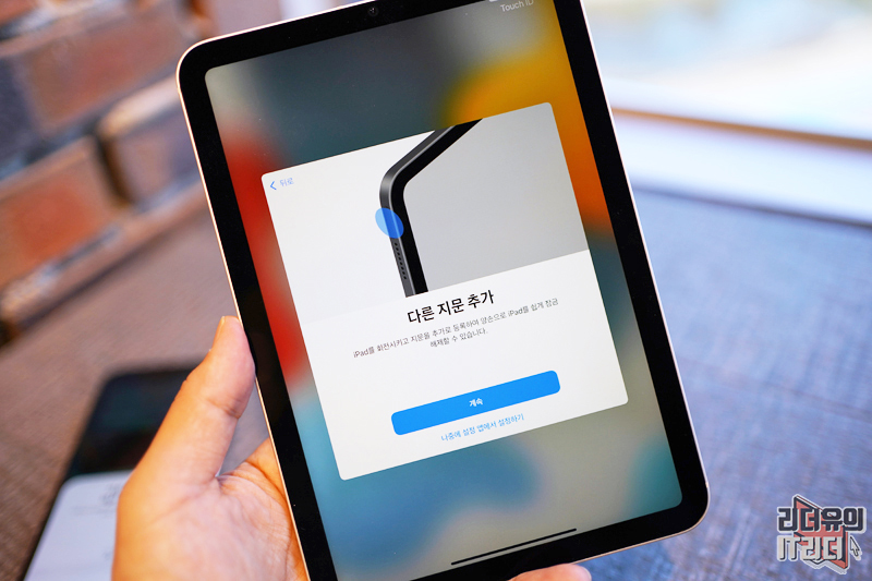 그리고 또 하나의 지문을 추가하라고 나옵니다. 아이패드니까 세로 가로 들고 있는 위치가 달라지니 아이패드를 회전시켜서 지문을 추가로 등록하게 안내하고 있습니다. 별거 아니지만 애플의 센스가 돋보이는 부분입니다.