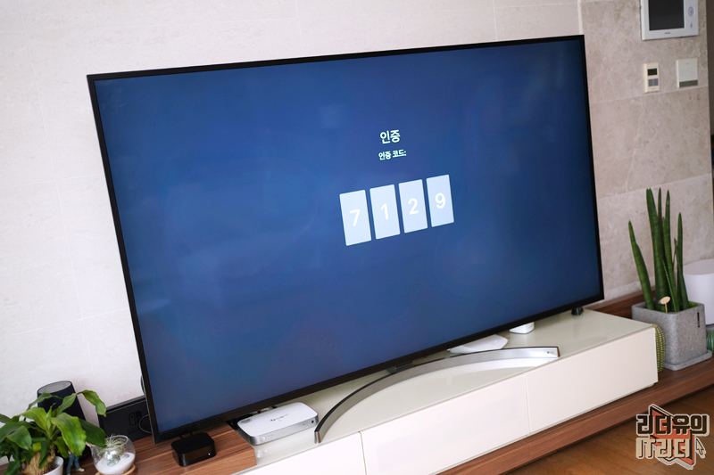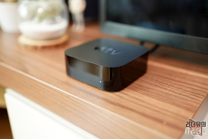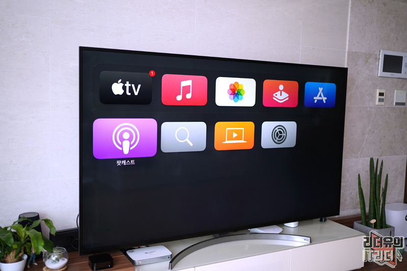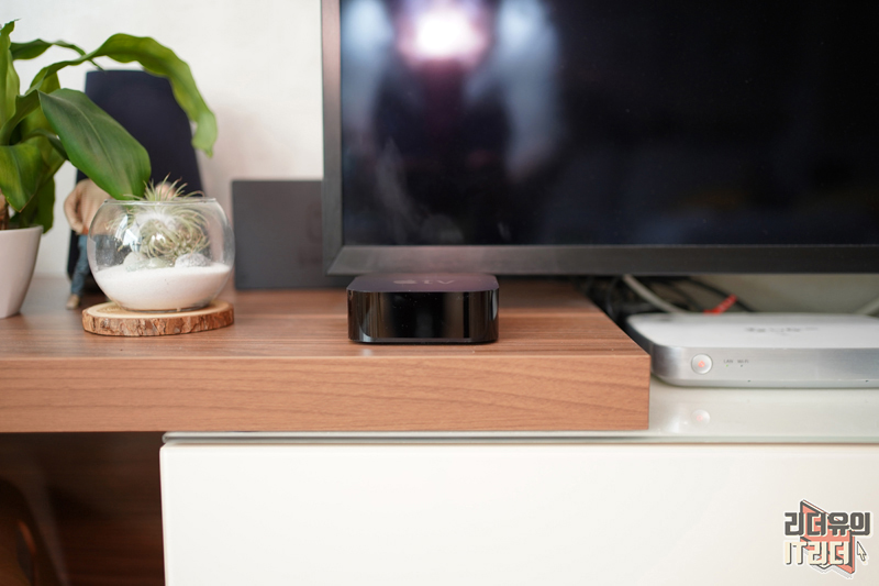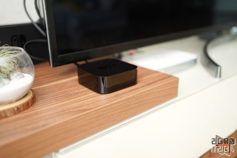 애플 TV 4K를 TV 앞에 설치한 모습입니다. 보통 셋탑박스들은 숨기고 싶은데요. 애플 TV 4K는 보여주고 싶은 디자인이라 앞에 당당하게 자리를 차지하게 설치했습니다.
