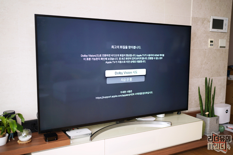 애플 TV 4K가 4K 돌비 비전 60Hz로 전환을 했습니다.영상이 선명하게 보이면 확인을 선택하고 화면이 깜빡이거나 문제가 있을 경우는 취소를 선택하면 됩니다.