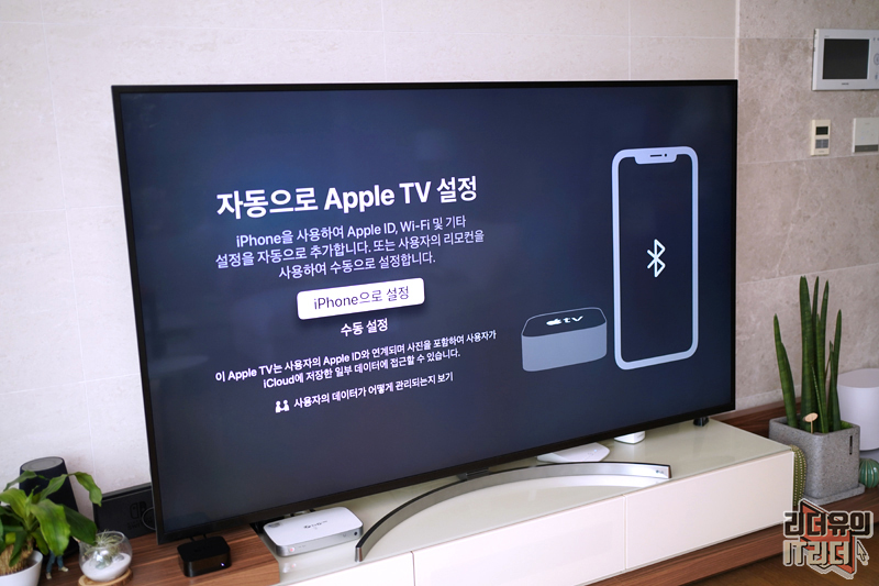 애플 TV 4K를 쉽게 설정할 수 있도록 자동으로 애플 TV 설정이 안내됩니다. 아이폰으로 설정을 선택하면 애플 ID, 와이파이, 기타 설정을 아이폰에서 가져와서 쉽게 설정이 됩니다.