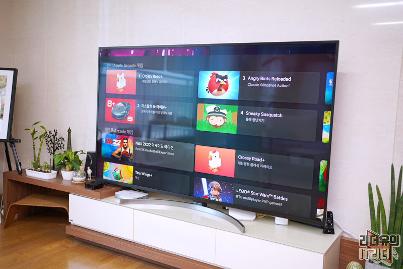 애플 아케이드를 통해 다양한 게임들을 TV에서 할 수 있습니다. 콘솔 게임처럼 컨트롤러 연결해서 대화면에서 게임을 즐길 수 있습니다.