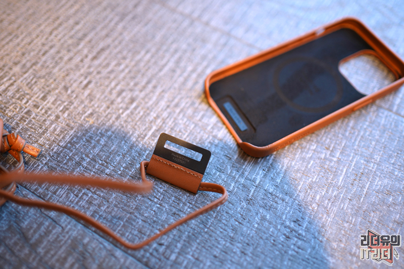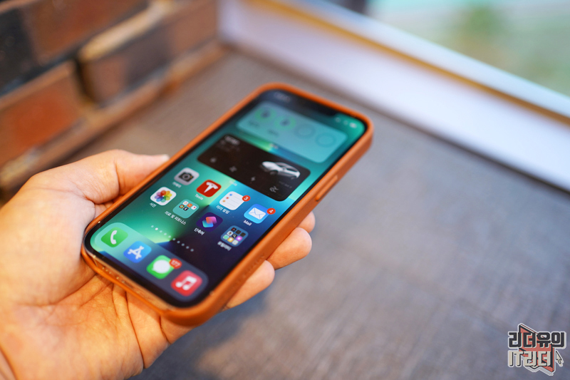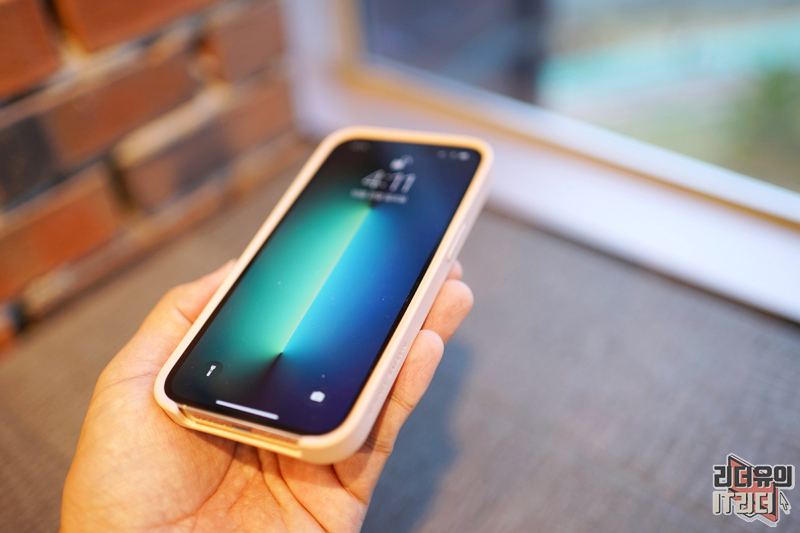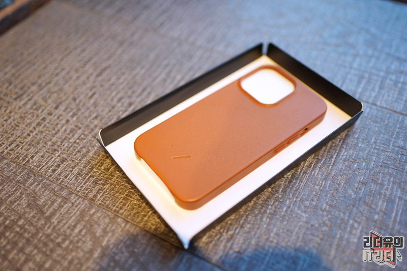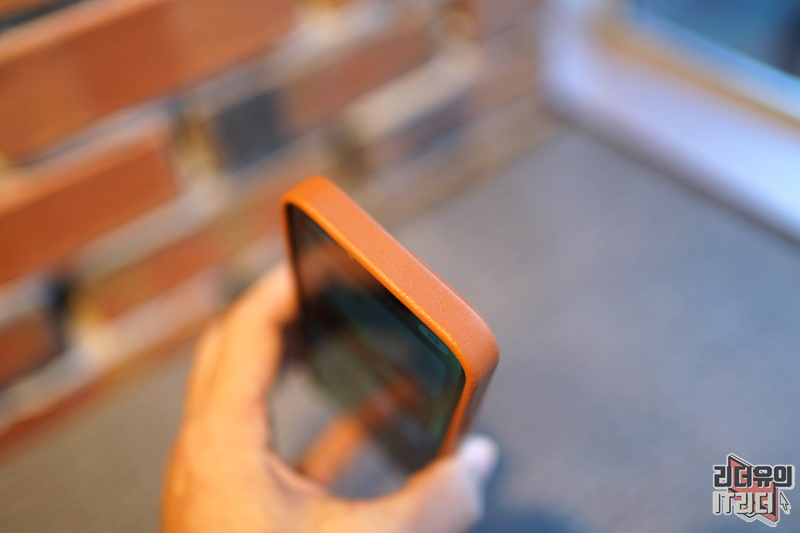 딱 맞게 나온 사이즈라 힘을 줘서 밀착을 시켜주면 됩니다. 완벽한 핏감을 보여주고 있고 고급스러운 가죽 라인이 아이폰13 프로를 더욱 고급스럽게 보여주고 있습니다.