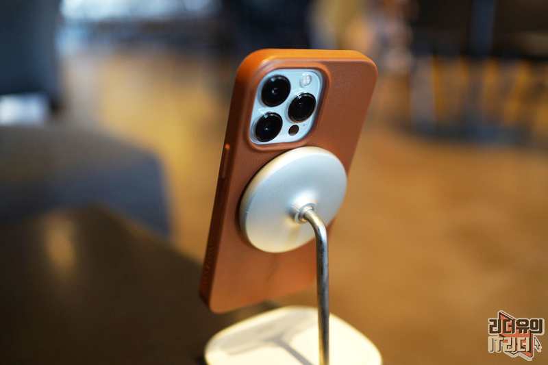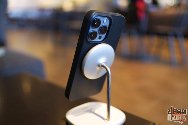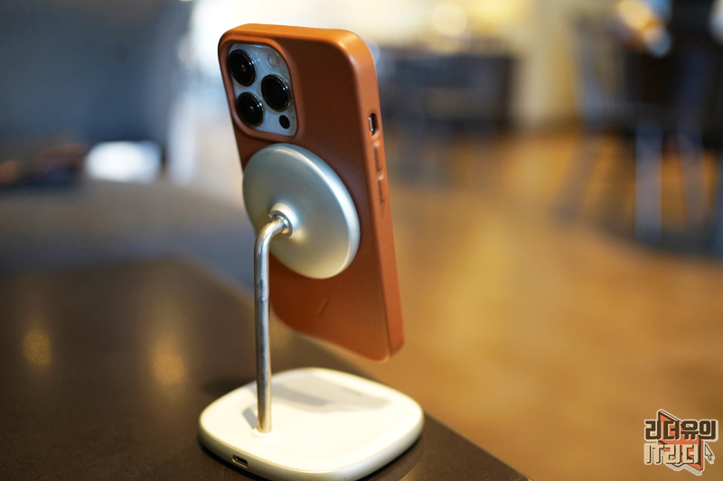 맥세이프 충전 거치대에 장착한 모습입니다. 블랙 가죽 좋아하는 분들에게 딱 입니다.
