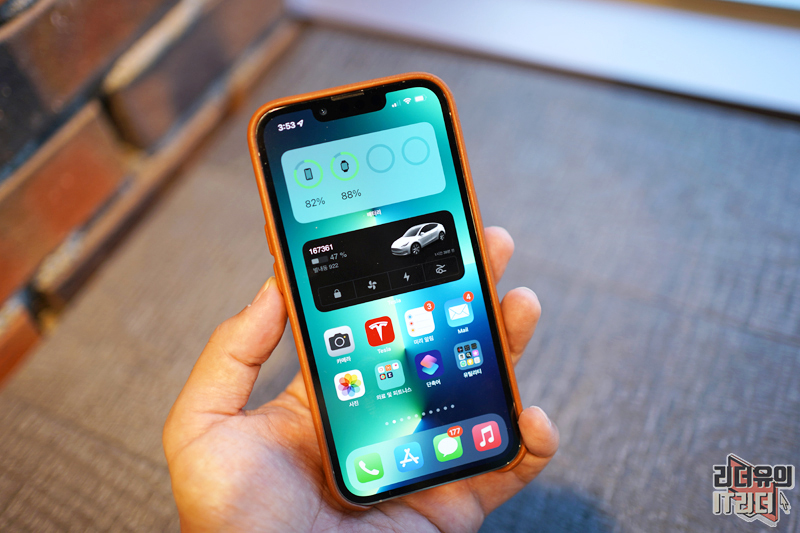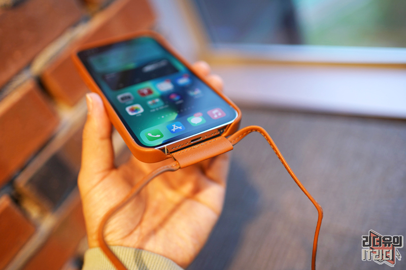 딱 맞게 나온 사이즈라 힘을 줘서 밀착을 시켜주면 됩니다. 완벽한 핏감을 보여주고 있고 고급스러운 가죽 라인이 아이폰13 프로를 더욱 고급스럽게 보여주고 있습니다.