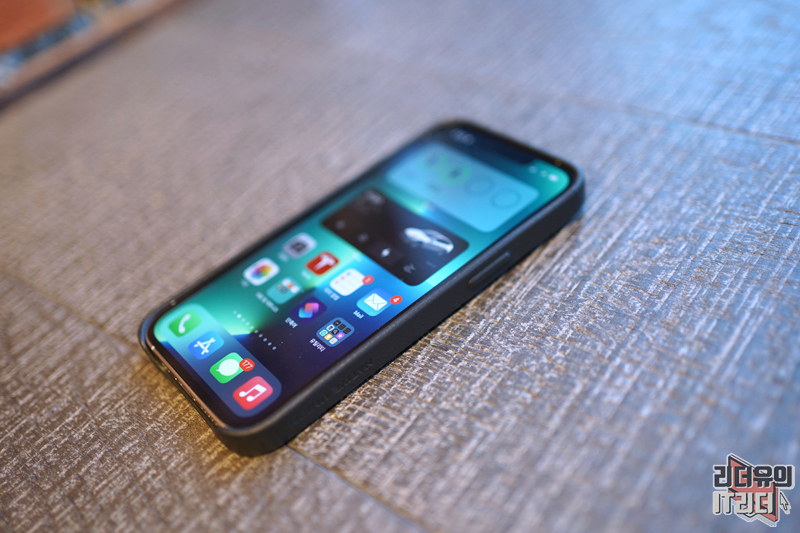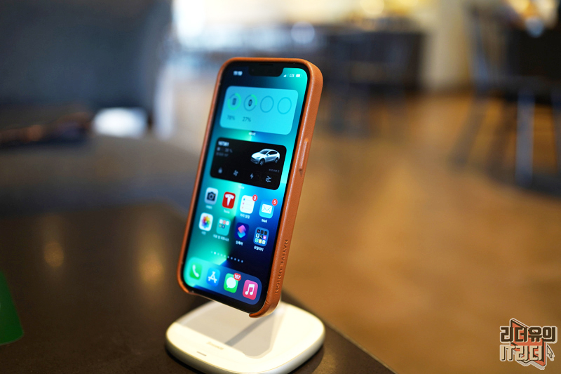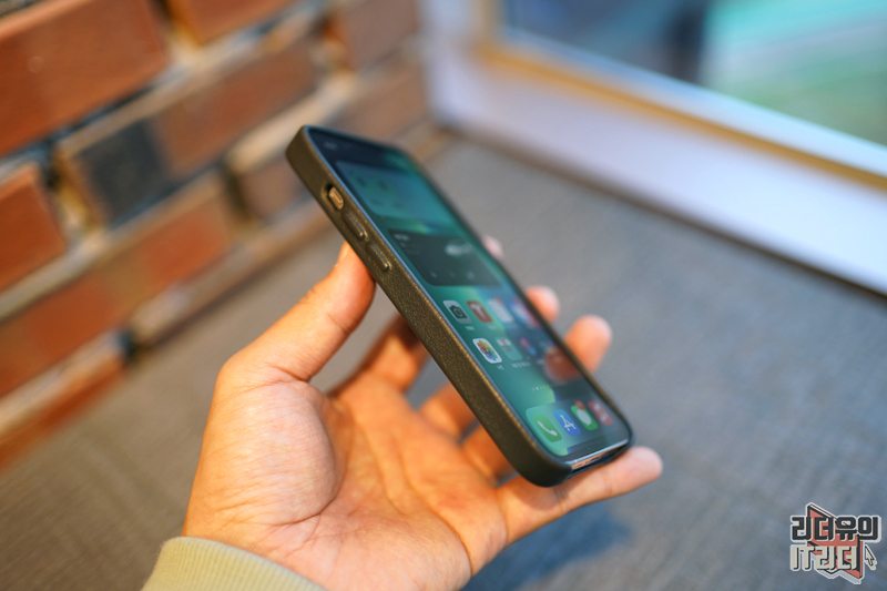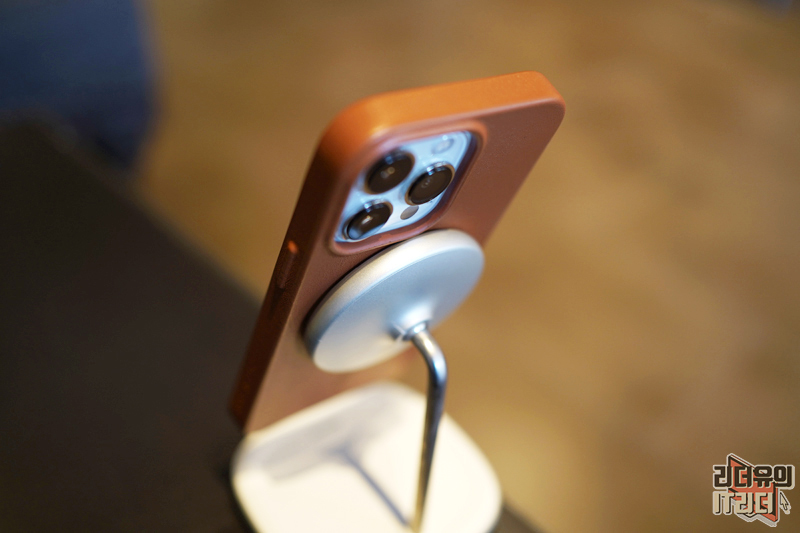 맥세이프 충전 거치대에 장착한 모습입니다. 블랙 가죽 좋아하는 분들에게 딱 입니다.