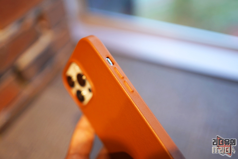 아랫면은 아이폰13 프로 라이트닝 단자와 스피커를 가리지 않게 뚫려 있는 디자인입니다. 이 부분에 충격이 전해지지 않을까 걱정하실 수 있는데 디스플레이 보다 가죽이 돌출되어 있어 모서리에 찍히지 않는한 걱정하지 않으셔도 됩니다.