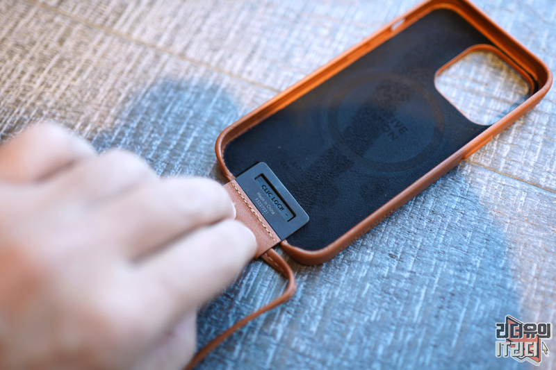아래쪽에는 클릭 케이스의 특징이라 할 수 있는 클릭 락이 있습니다. 여기에 SLING FOR CLIC을 연결해 미니크로스백 처럼 사용할 수 있는 것입니다. 여성분들이 좋아할 수 있는 요소입니다.