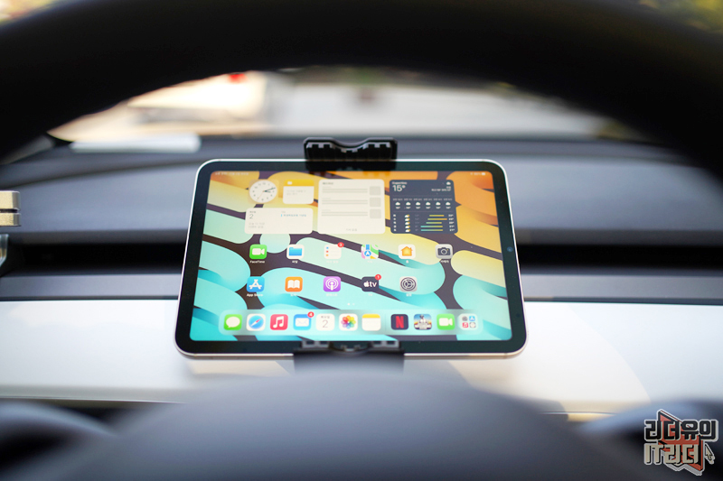 테슬라 모델Y에 아이패드 미니 6세대를 장착하면 이렇게 시원하게 화면을 볼 수 있을 것 같지만 운전자의 위치에 따라 화면이 잘려 보이는 문제가 있습니다.