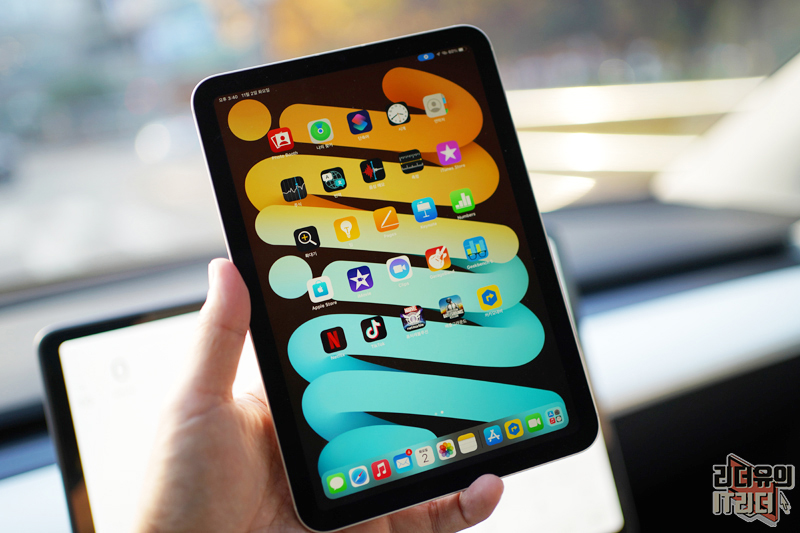 테슬라 모델Y에 아이패드 미니 6세대를 장착하면 이렇게 시원하게 화면을 볼 수 있을 것 같지만 운전자의 위치에 따라 화면이 잘려 보이는 문제가 있습니다.
