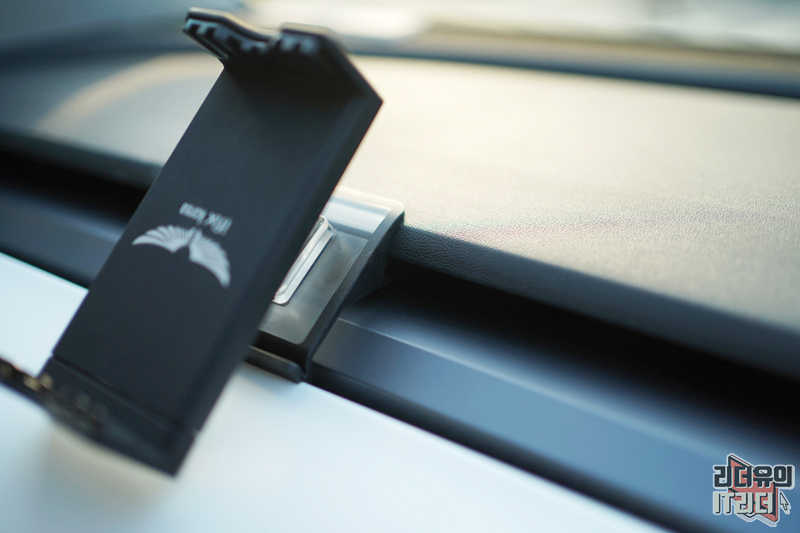 이렇게 테슬라 모델Y에 거치를 했습니다. 앞에 홈에 끼우는 방식이라 안정된 거치를 할 수 있습니다.