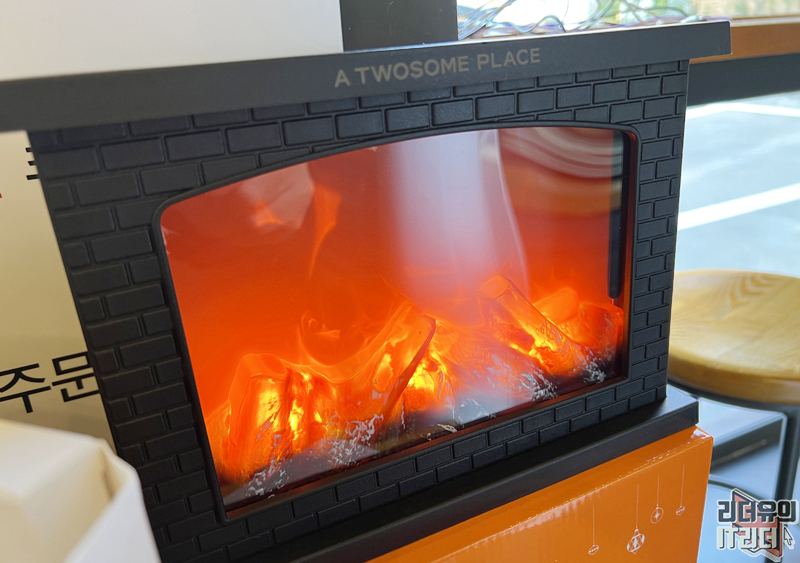 가까이서 보면 이런 느낌입니다. 장작 효과를 내는 느낌이 괜찮죠? 밤에 보면 더 예쁠 것 같습니다. 다만 불꽃이 움직이는 효과는 없습니다. 그냥 조명이라고 보시면 됩니다. 그리고 상단에는 투썸 플레이스라고 새겨져 있습니다.