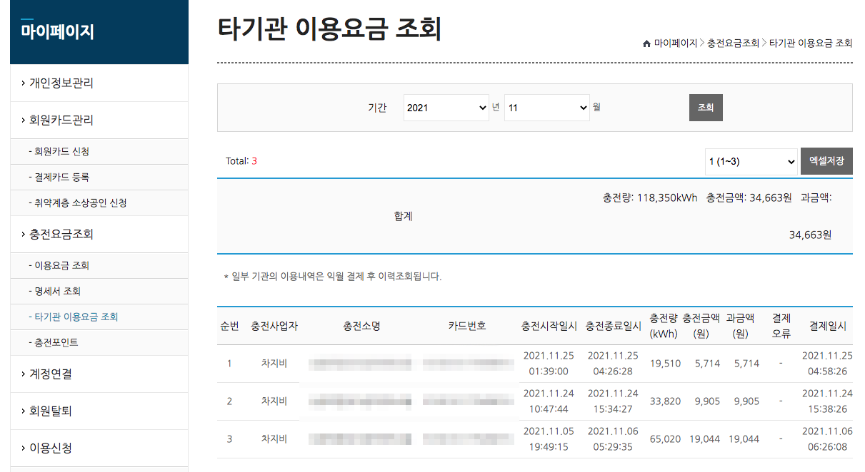 전기차를 구입하면 기본적으로 저공해차 통합누리집 사이트에서 회원카드를 발급 받으실 것입니다. 이 카드는 통합적으로 사용되는 전기차 카드인데요. 결제 카드를 연결해서 사용할 수 있기 때문에 여기서 결제 내역을 확인해 볼 수 있습니다.