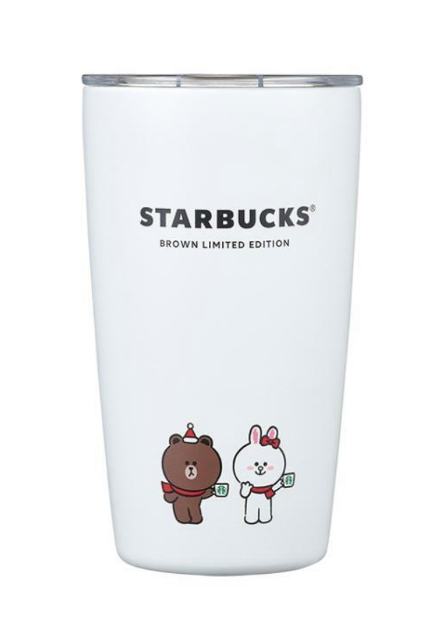 화이트 컬러의 산뜻한 텀블러로 스타벅스 컵을 든 브라운과 코니 입니다. 브라운이 산타모자도 쓰고 있어서 더욱 귀엽습니다. 재질은 스테인리스틸로 되어 있어 보냉 보온 기능을 합니다. 용량은 355ml 입니다.