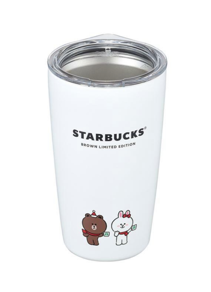 화이트 컬러의 산뜻한 텀블러로 스타벅스 컵을 든 브라운과 코니 입니다. 브라운이 산타모자도 쓰고 있어서 더욱 귀엽습니다. 재질은 스테인리스틸로 되어 있어 보냉 보온 기능을 합니다. 용량은 355ml 입니다.