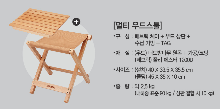 던킨 도너츠 캠핑 멀티 우드스툴은 패브릭 체어와 우드 상판, 수납 가방으로 구성되어 있습니다. 무게는 90kg까지 버틸 수 있다고 합니다.