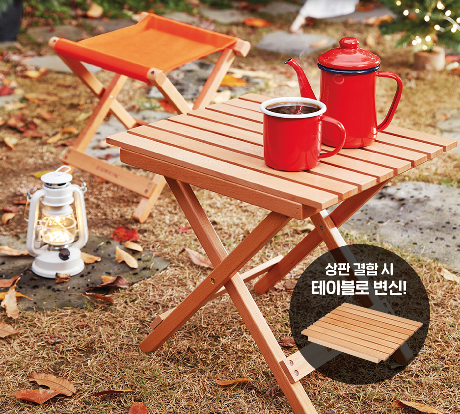 이번에 선보인 던킨 도너츠 멀티 우드스툴은 캠핑체어와 캠핑테이블을 사용할 수 있는 변신형 제품입니다. 캠핑 의자에 우드 상판을 결합해 케이블도 사용할 수 있게 한 제품인데요. 아이디어도 괜찮고 디자인도 예쁘게 잘 나온 것 같습니다.