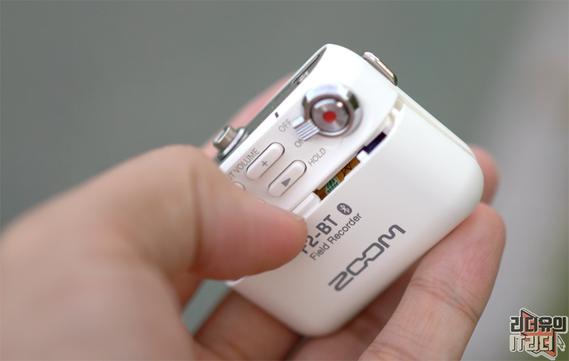 오른쪽의 은색 버튼으로 되어 있는 건 녹음 관련된 버튼입니다. 전원은 스위치 방식으로 되어 있습니다. OFF, ON, HOLD를 선택할 수 있는데요. HOLD는 녹음 중 잘못 눌러서 꺼지는 걸 방지하기 위한 모드라고 보시면 됩니다.