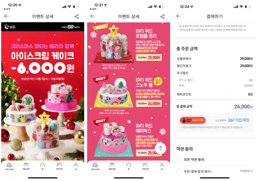 이렇게 해피오더 앱에서 베스킨라빈스 크리스마스 케이크 가격 할인을 하고 있습니다. 이것도 카드 할인을 포함해서 6,000원인데요. 기본 할인 3,000원을 받았다고 보더라도 기본 케익에서 할인이 들어가는 것이기 때문에 베스킨라빈스 오르골을 더 비싸게 사는 경우가 됩니다.