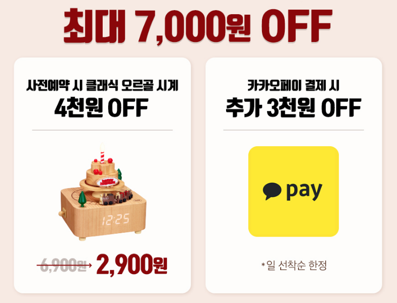 베스킨라비스 클래식 오르골은 크리스마스 케이크 구매 시 구입할 수 있고 사전예약 혜택으로 4천원 할인이 들어갑니다. 그리고 카카오페이 결제시에 매일 선착순으로 추가 3천원 할인을 받을 수 있습니다. 다 하면 저렴하게 살 수 있겠죠.