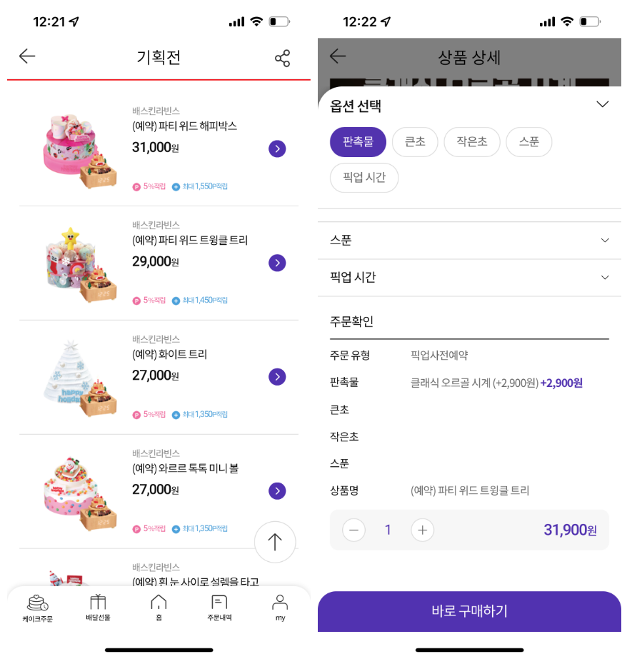 구입은 해피오더 앱으로 할 수 있는데요. 케익 가격에서 2,900원이 추가되는 구조입니다. 문제는 베스킨라빈스 오르골이 할인을 하고 있지만 기본적인 케이크의 경우 다른 할인 행사가 이뤄지고 있습니다.