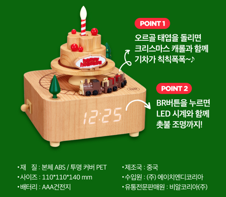 베스킨라빈스 클래식 오르골 시계는 케이크 디자인을 가진 굿즈로 초에 조명이 들어오고 아래는 전자시계, 위에는 기차가 도는 예쁜 디자인을 가지고 있습니다. 크리스마스 캐롤도 나온다고 하니 크리스마스 인테리어 소품으로 최적의 매력을 갖추고 있습니다.