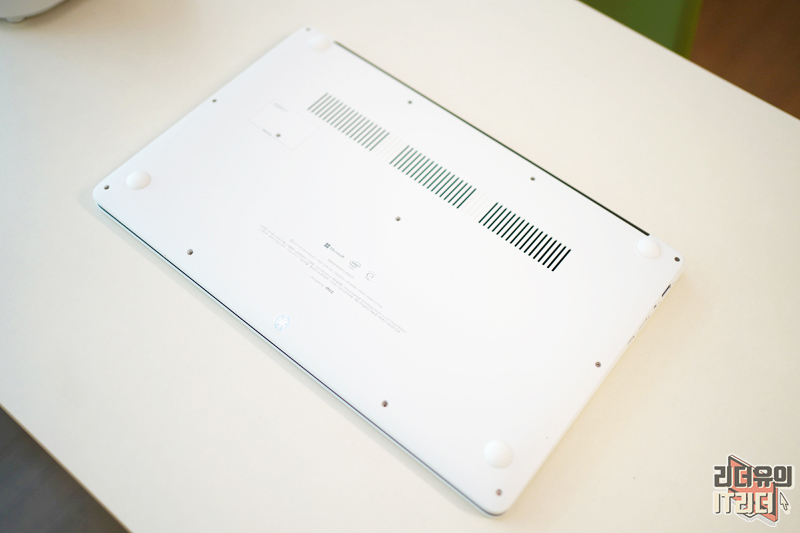 아이뮤즈 스톰북5 바닥면 모습입니다. 네 귀퉁이에는 안정적인 거치를 할 수 있도록 고무패킹이 있습니다. 무엇보다 인상적인 점은