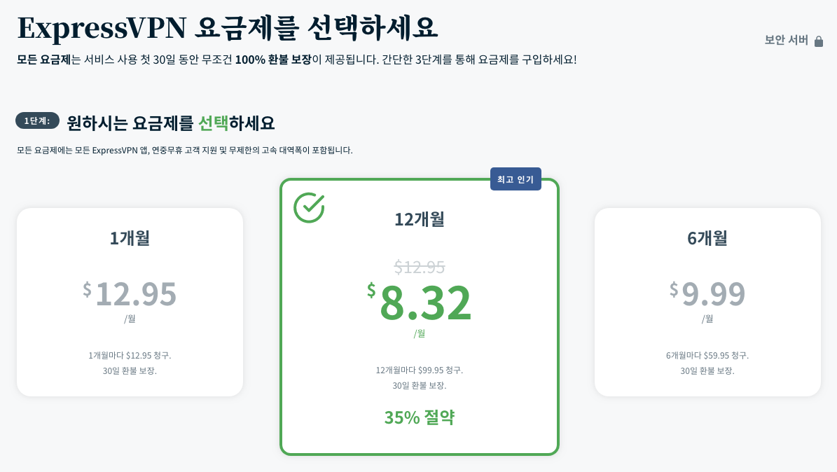 ExpressVPN (익스프레스 VPN) 요금제는 3가지로 구성되어 있습니다. 1개월 이용 요금, 12개월 이용 요금, 6개월 이용 요금으로 구성되어 있습니다. 계속해서 VPN 서비스를 사용할 분이라면 당연히 12개월 요금제를 선택하는게 좋겠죠.