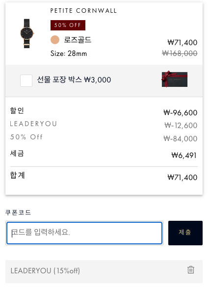 쿠폰 코드 입력란이 나오는데 여기서 leaderyou 라고 입력을 하고 제출을 누르면 15% 할인 혜택이 추가로 주어집니다.