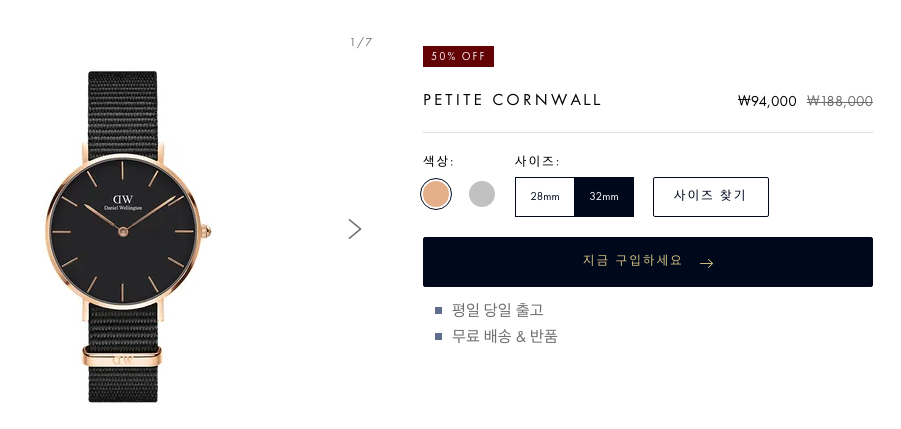 예를 들어서 현재 50% 할인하고 있는 시계입니다. 여기서 지금 구입하세요를 선택하세요.