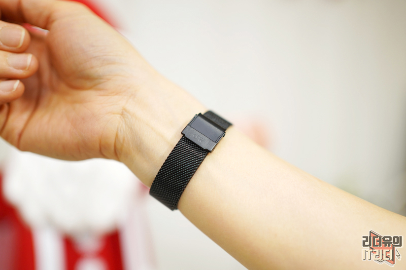 손목에 착용했을때 느낌입니다. 얇은 손목에 잘 어울리는 스트랩 두께라 완벽한 착용감과 패션의 완성을 느낄 수 있습니다.