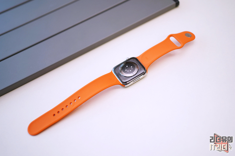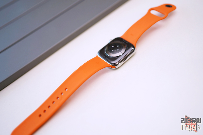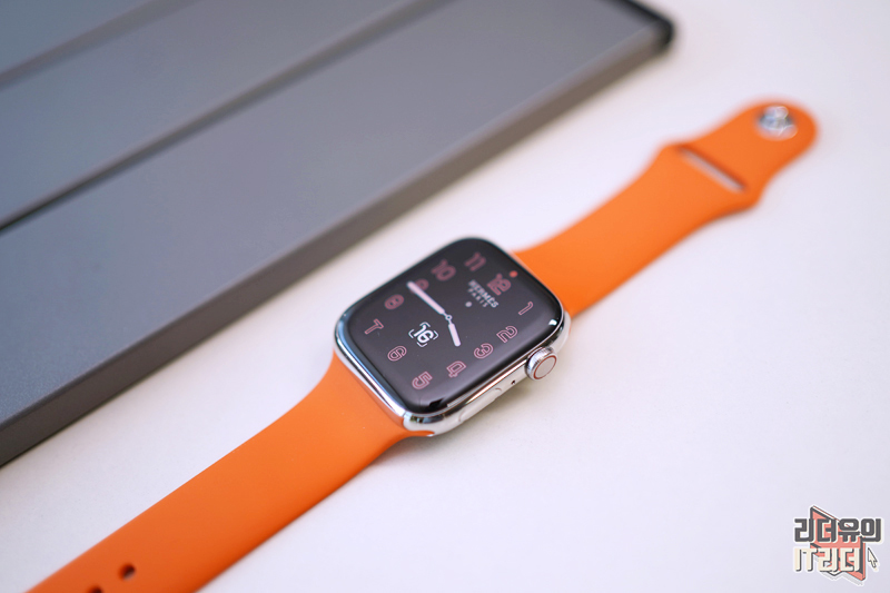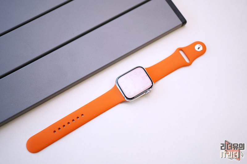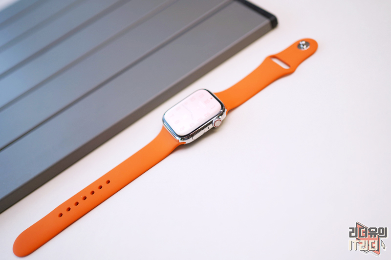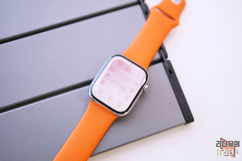 애플워치7 에르메스 에디션 스포츠 밴드를 장착한 모습입니다. 에르메스 컬러라 할 수 있는 오렌지 색상으로 되어 있습니다. 에르메스 색상이라고 생각하니 더 예쁘게 느껴집니다. (뇌이징...)