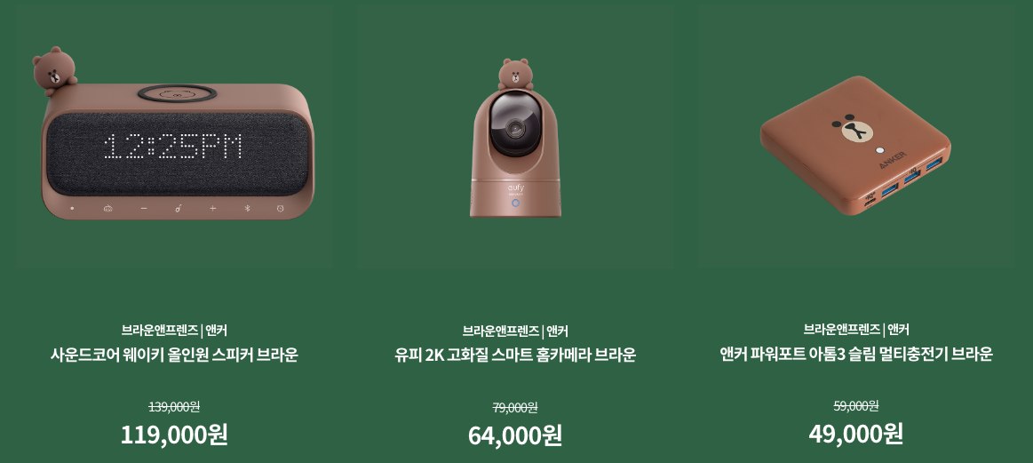 앤커 라인프렌즈 콜라보 제품의 가격은 브라운 블루투스 스피커 139,000원인데 런칭 혜택으로 119,000원이고 브라운 홈카메라는 79,000원인데 런칭 혜택으로 64,000원입니다. 브라운 멀티충전기는 59,000원인데 런칭 혜택으로 49,000원 입니다.