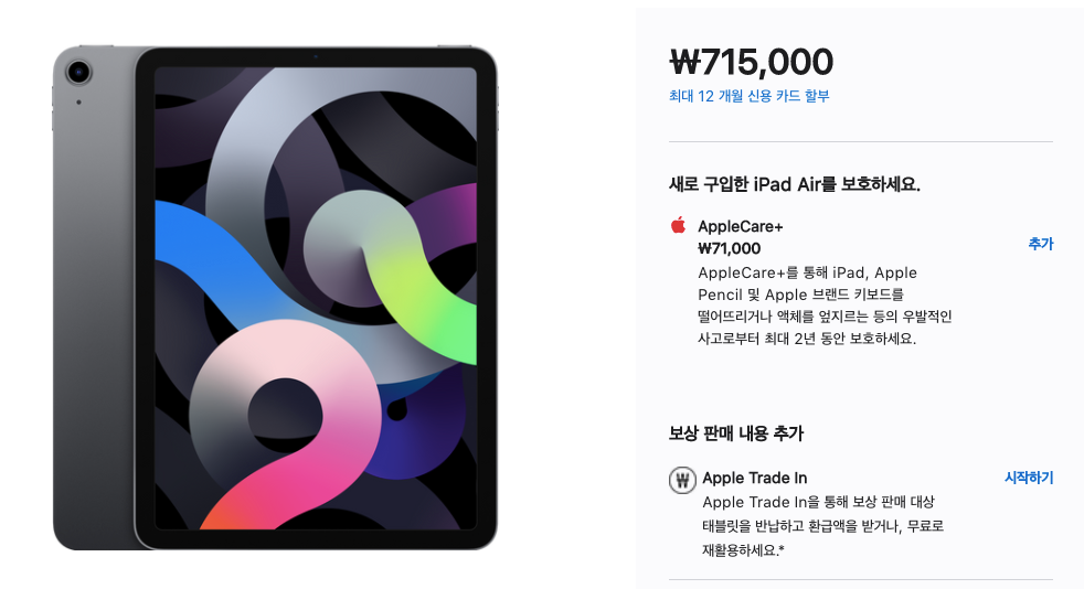 그리고 아이패드 에어 4세대도 할인을 받습니다. 715,000원 부터 구입이 가능하니 대박이죠. 애플 교육할인 서비스 대박입니다. 그리고 아이패드도 마찬가지로 에어팟 2세대를 무료로 받을 수 있으니 꼭 놓치지 마세요