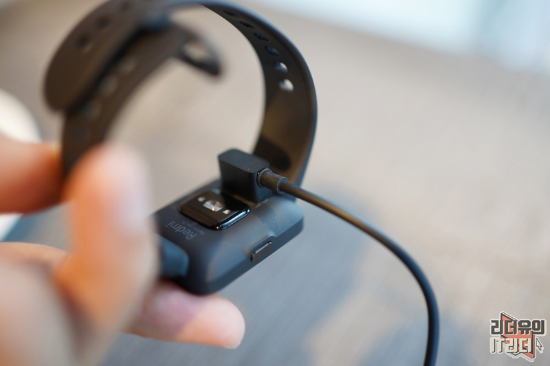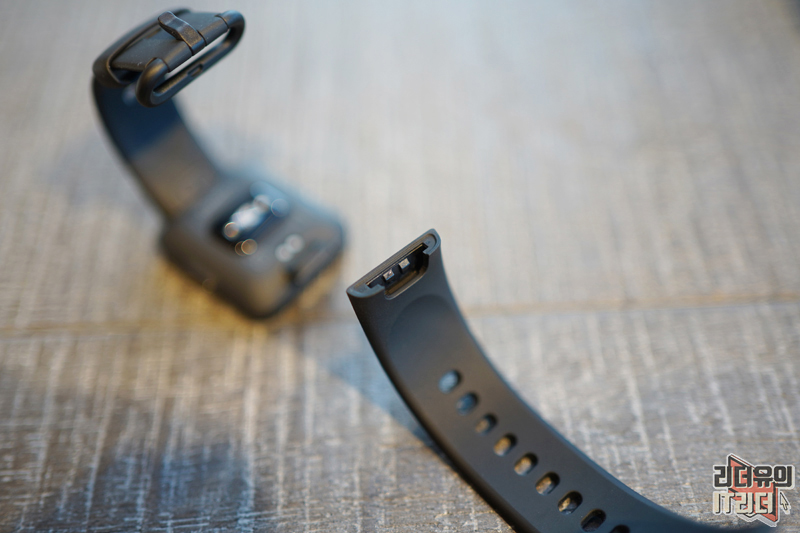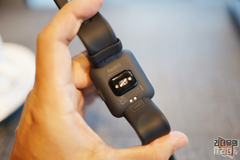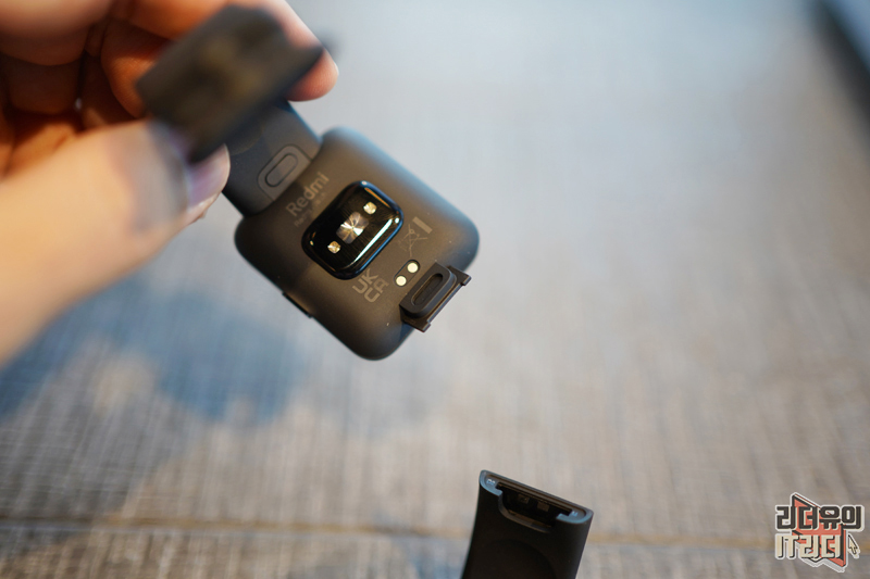 안쪽에는 심박동센서, 산소포화도 측정 센서가 있습니다. 그리고 하단부에 충전 단자가 있는데요. 전작은 도킹 방식을 적용했는데 샤오미 미워치2 라이트에서는 마그네틱 방식으로 개선이 되었습니다.