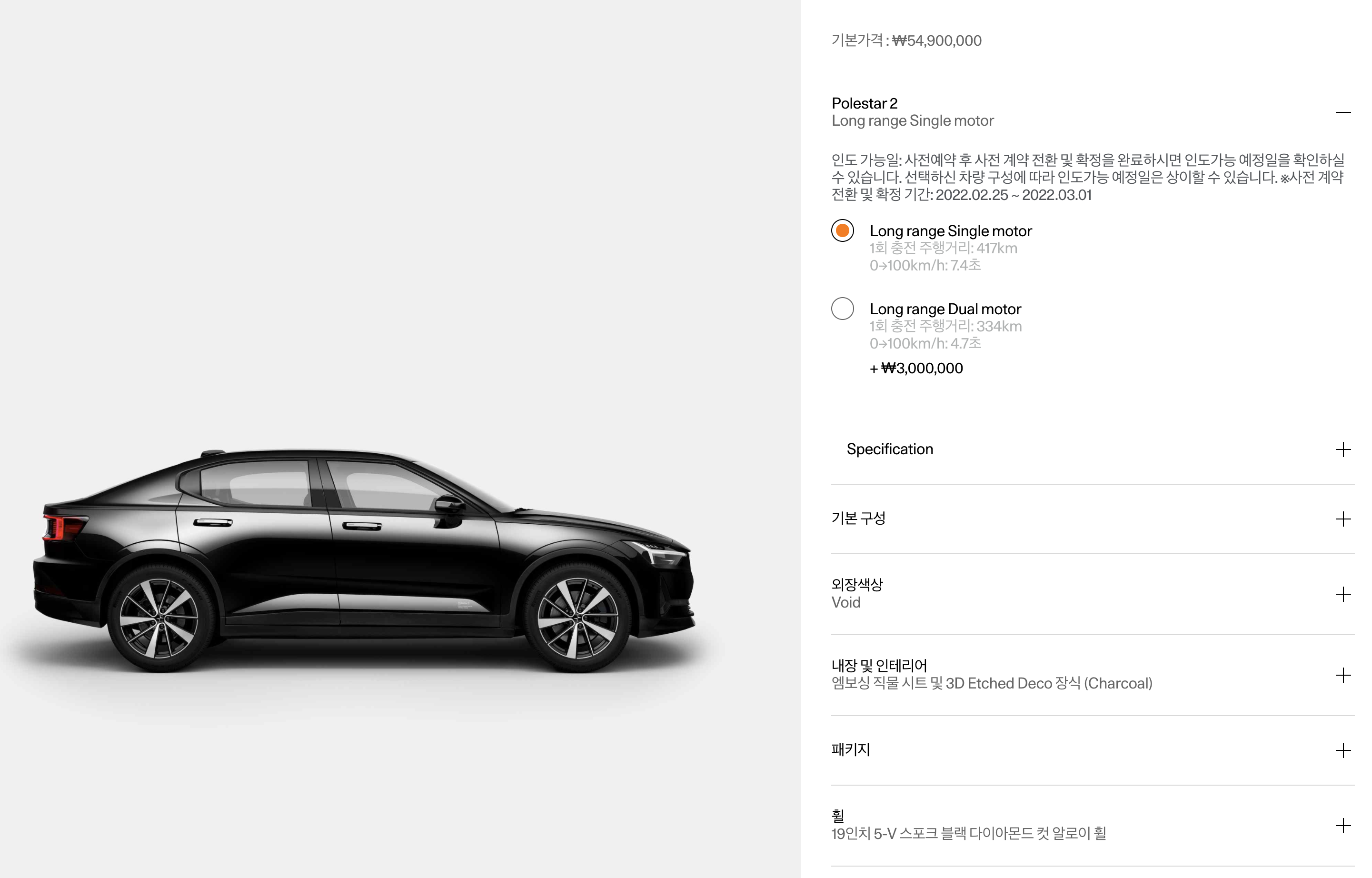 폴스타2 사전예약 계약금은 100만원이고 3월 부터 인수가 가능합니다.