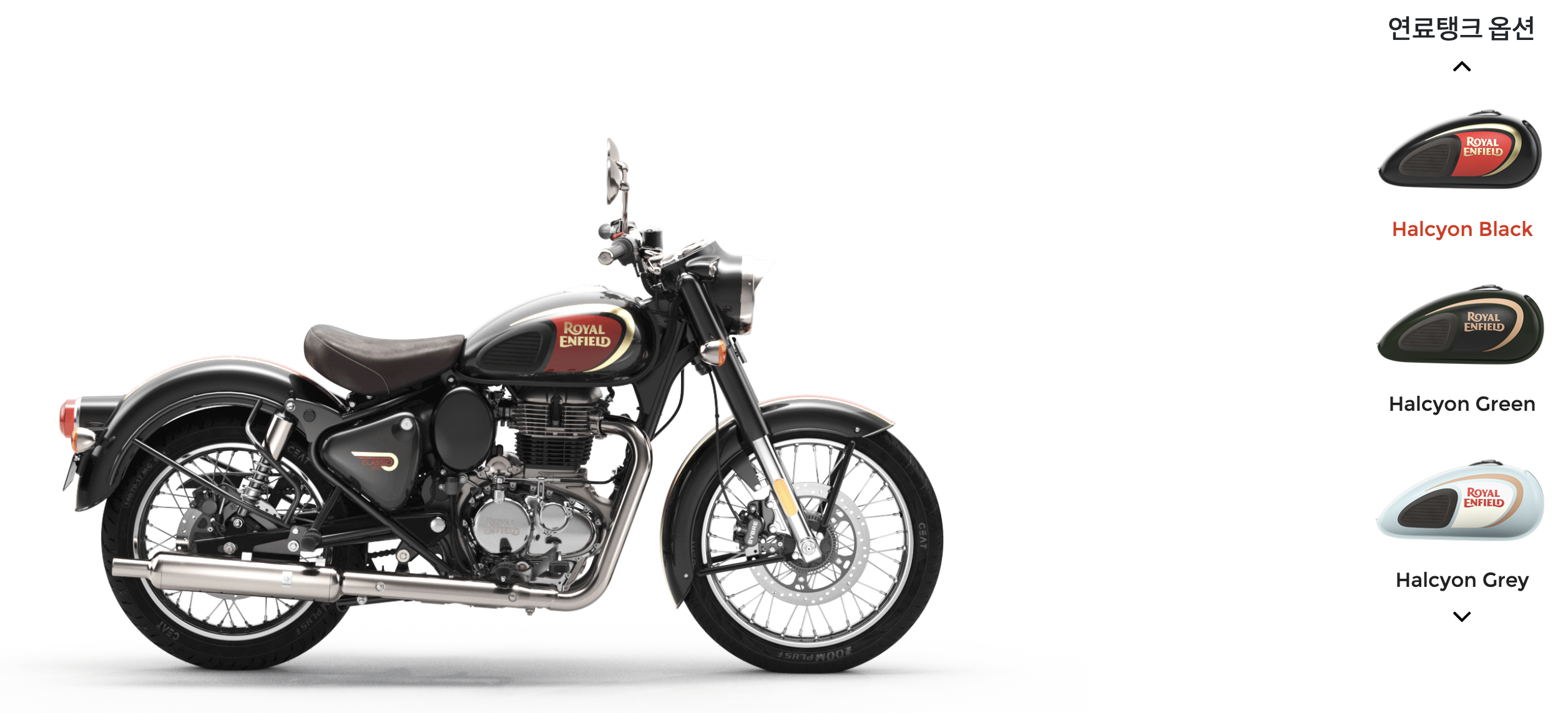 2022 로얄엔필드 클래식 350은 다양한 색상 조합을 통해 스페셜한 디자인 매력을 살리고 있습니다. 연료탱크 옵션을 다양하게 선택할 수 있어 독특한 컬러 감성과 현대적인 클래식함을 잘 살리고 있습니다. 종류가 많으니 개개인의 취향따라 폭넓은 선택을 하시면 됩니다. 참고로 연료탱크 색상에 따라 가격 차이가 있습니다.