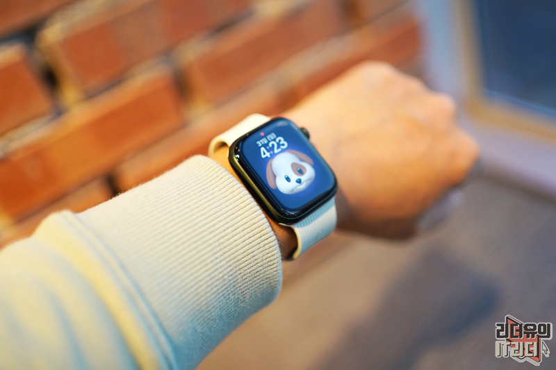 애플워치7에 완벽하게 장착된 모습입니다. 참고로 애플워치7 그린 색상인데요. 밝은 색상의 네이티브 유니온 커브 스트랩 세이지 색상이지만 잘 어울립니다. 어두운 계열의 애플워치도 잘 어울리는 애플워치 밴드입니다.