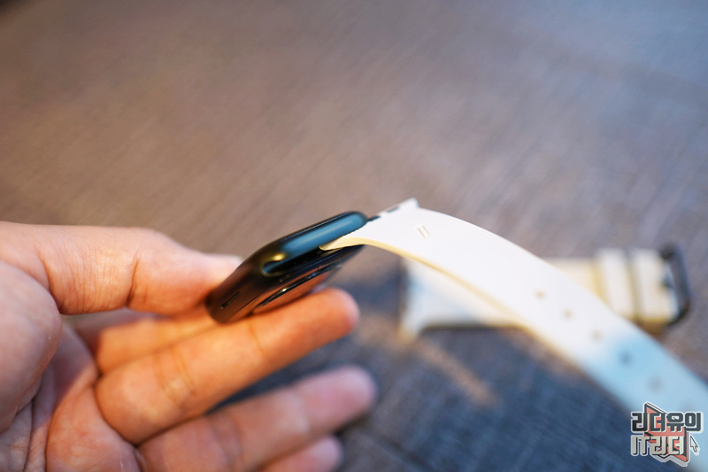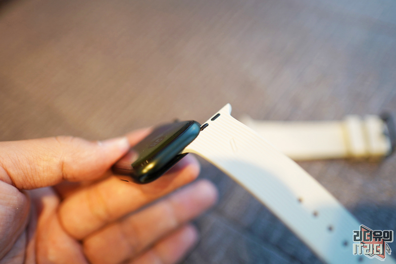 애플워치 스트랩 장착은 너무나 간단합니다. 슬라이드 방식으로 밀어서 넣어주면 끝입니다. 스마트워치 밴드 교환 방식 중 애플워치 만큼 편한 방식은 없습니다.